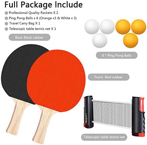 Our ping pong paddle set includes 2 high-performance paddles, a portable retractable net, and 6 ping pong balls. It’s perfect for family members or Ping Pong enthusiasts to enjoy the sport anytime and anywhere.