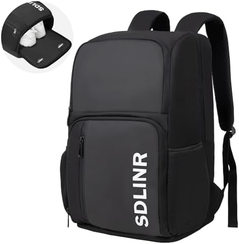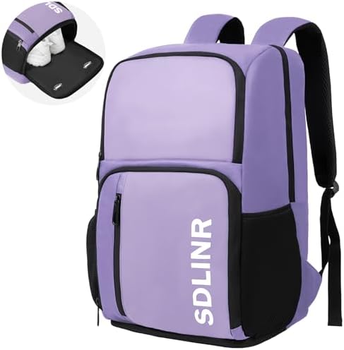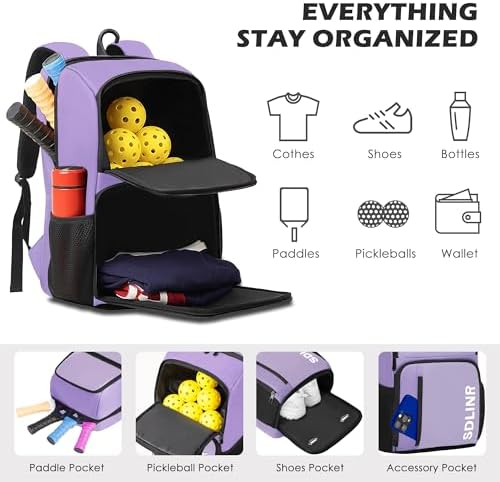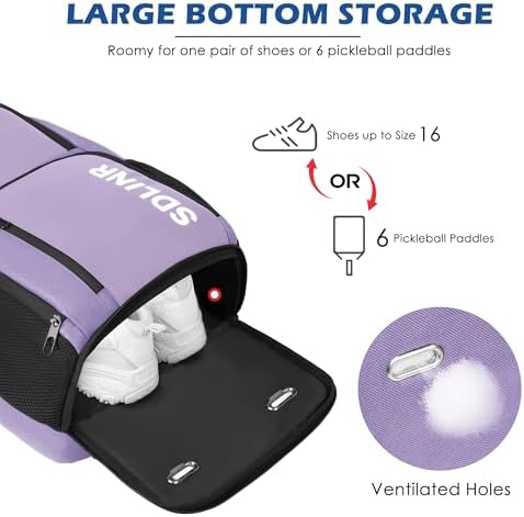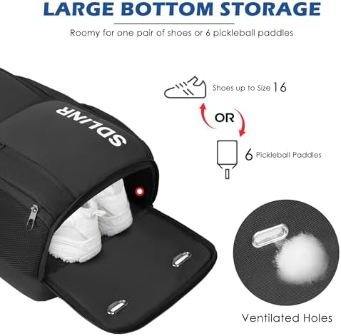 The SDLINR pickleball bag features one separate compartment for 4 paddles. Spacious vented bottom storage fits up to size 16 shoes or 6 paddles when not used for shoes.
