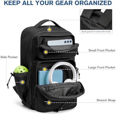 G4Free Pickleball Bag Black Fits 2 to 6 Paddles Attributes: Large Pickleball Backpack with Fence Hook, Suitable for Men