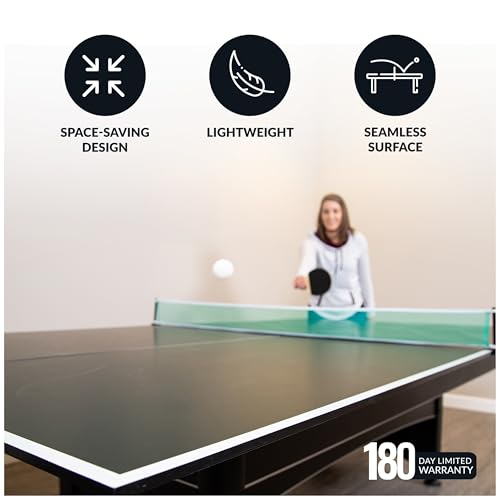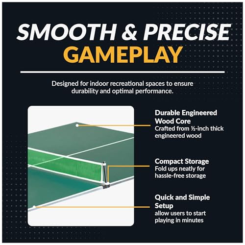 PLAY LIKE A PRO – Our tournament-level ping pong table topper is designed with a regulation 9-ft x 5-ft size, providing you with an authentic playing experience. The ½-inch thick engineered wood surface and green PVC laminate ensure consistent ball bounce and durability.