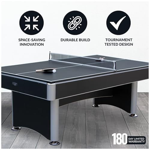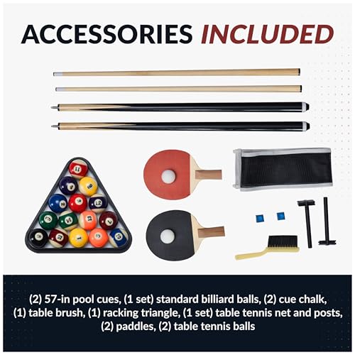 ALL-INCLUSIVE AND COMFORTABLE – includes everything you need: two 57-inch cues, billiard balls, chalk, triangle, brush, table tennis net and posts, two paddles, and ping pong balls. Enjoy peace of mind with a 180-day limited warranty.
