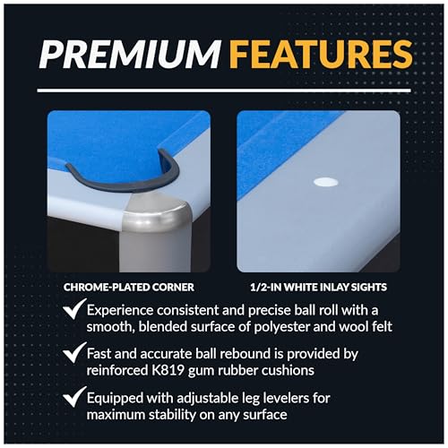 DURABLE AND STurdy CONSTRUCTION – built from engineered wood with a poly-sealed playfield, this table combines durability with playability. High-quality K-66 gum rubber cushions and blended wool/polyester felt ensure smooth gameplay.