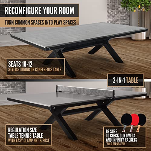 Convert any room into a game room by clamping on the quick-release ping pong net. Easily switch between a ping pong table, a 12-seater conference table, a 10-seat dining table, or enhance your man cave with class.