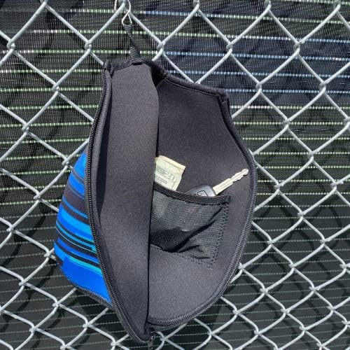 Unique to PBAW! The inside mesh pocket keeps your phone safe and secure. When playing on the court, tuck your keys or wallet in the paddle holder on the fence. The outside pocket holds two pickleballs, your keys, or wallet. When you hang it up, nothing falls out.