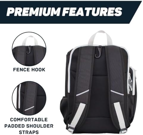 This backpack is perfect for storing balls, paddles, and even fits elongated paddles. It stands upright on its own or can be hung on the court fence using a fence hook.