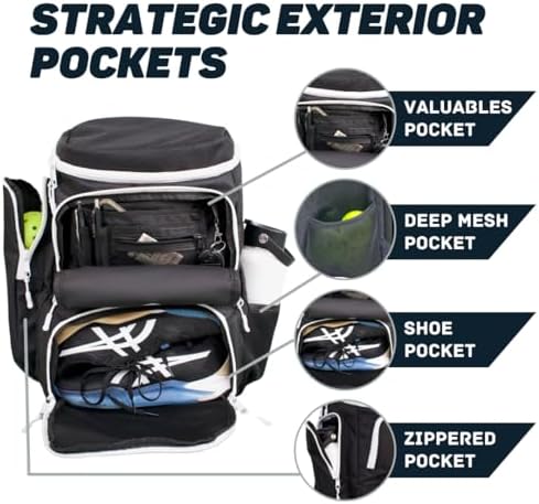 This large pickleball backpack offers 14 pockets and compartments to keep your gear organized. It holds 2 water bottles, sunglasses, keys, wallet, phone, clothes, shoes, gloves, and pickleball balls and paddles. There’s even a separate shoe compartment.