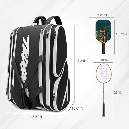 Designed with specialized pockets for 4 paddles and ample space for additional items, the bag comfortably holds 2 pickleball rackets in each of the 2 specific compartments, perfectly fitting even wide and elongated racquets. The spacious main compartment provides extra storage for multiple items.