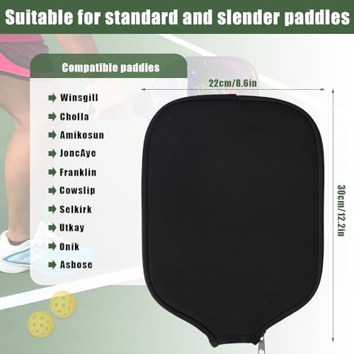 Product Size: The Racquet Cover measures 8.6 x 12.2 inches (22 x 31 cm). Standard sizes are usually 6-7.5 inches (15-19 cm) wide and 15.5-18 inches (39-46 cm) long (including grip length). It is compatible with Vinsguir, Joola, Franklin, Selkirk, and other paddle brands.
