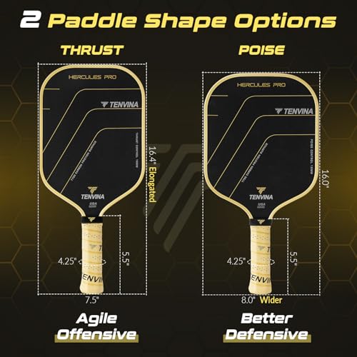 The HERCULES PRO Series features eye-catching golden edging, paired with the TENVINA linear logo and elegant parameter fonts printed on the carbon fiber textured surface. These paddles are extraordinary and brilliant, just like the pickleball racket player, showcasing your skills as the brightest star on the court.